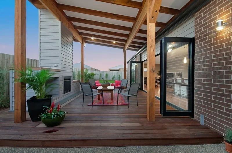 Integrated timber slatting or battening to shield your entertaining area from neighbours—essential for new estates in Armstrong Creek and Mt Duneed.